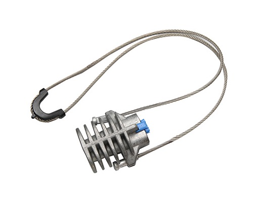 Предназначен для крепления и удержания в натянутом состоянии кабелей типа "8"с металлическим выносным силовым элементом диаметром от 6мм до 10мм. Зажим состоит из металлического корпуса, пары невыпадающих металлических клиньев (зажимное устройство) и хомута из стального нержавеющего троса длиной 500мм. Клинья имеют скругленную форму с зубьями, благодаря чему обеспечивает более "мягкое" сцепление зажима с несущим элементом кабеля. В этом случае кабель не повреждается в месте крепления, при действии на него рывков и чрезмерных продольных нагрузок. Блогодаря хомуту из стального оцинкованного троса более удобен в монтаже в отличии от аналогов с проволочным креплением.
