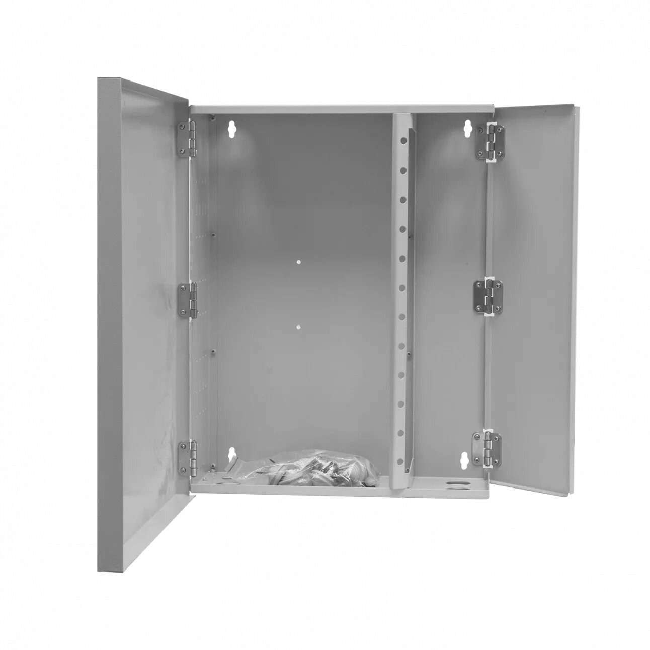 Шкаф кроссовый оптический настенный остоит из стального корпуса с окнами для установки съёмных планок с отверстиями для необходимых разъёмов, либо заглушек. Планки устанавливаются на быстросъёмные клипсы многоразового использования. От несанкционированного вскрытия дверь запирается на замок (все замки имеют одинаковые секретки). Крепление входящего оптического кабеля осуществляется прижимными планками за силовой элемент, либо хомутами (хомуты в базовый комплект не входят). Для удобства монтажа патч-кордов и обслуживания оптического кросса в кроссовом шкафу предусмотрена поворотная дверка со стороны съёмных планок. Поставка возможна как пустых кроссовых шкафов, так и полностью укомплектованных оптических кроссов.